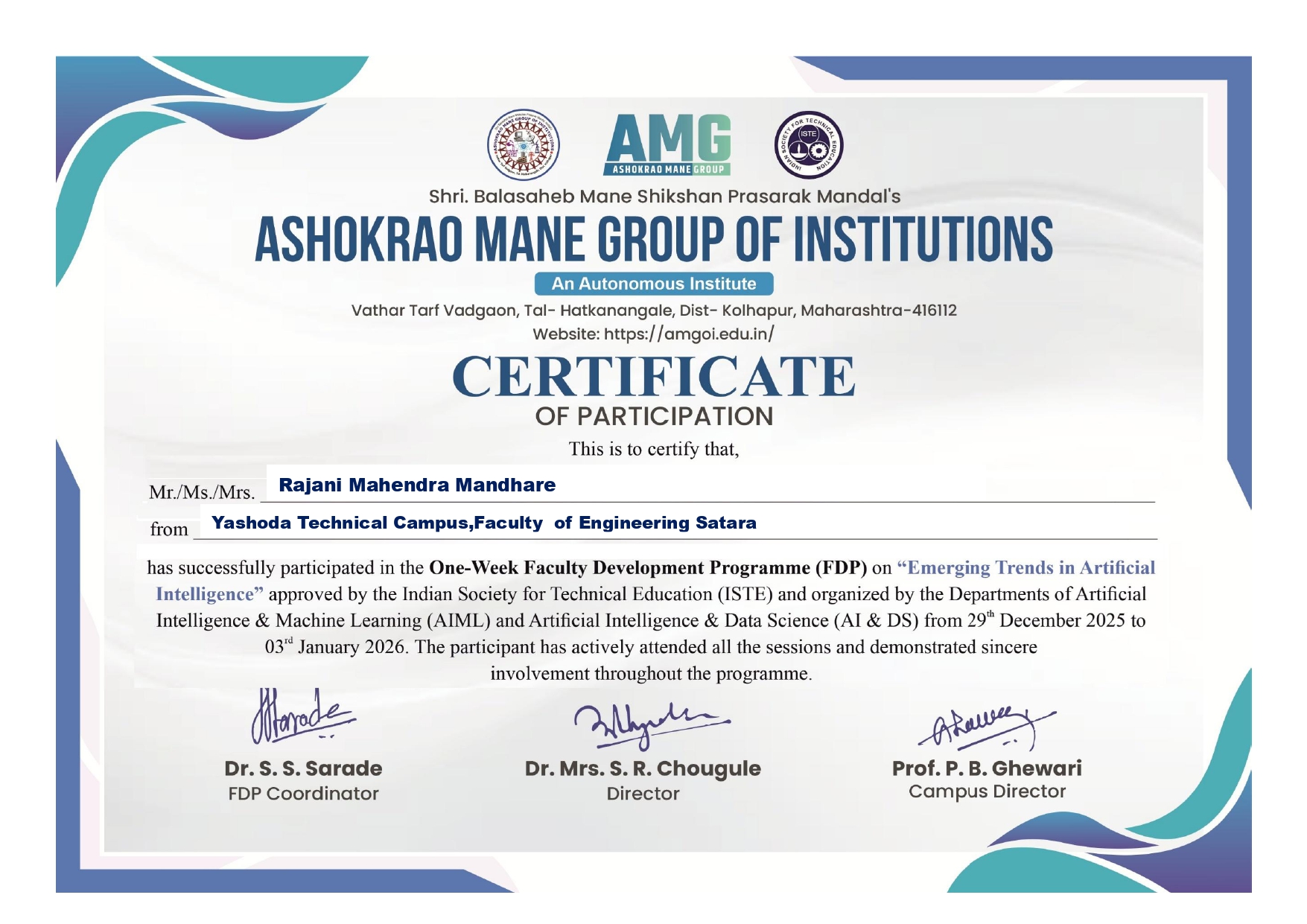 Mrs.SONIYA SAGAR ATPADKAR has successfully completed the ISTE approved Self-Financing Faculty Development Program on “Bridging AI and Robotics: Future of Intelligent Machines” held during 15.07.2025 to 19.07.2025 organized by Yashoda Technical Campus, Satara, Maharashtra.