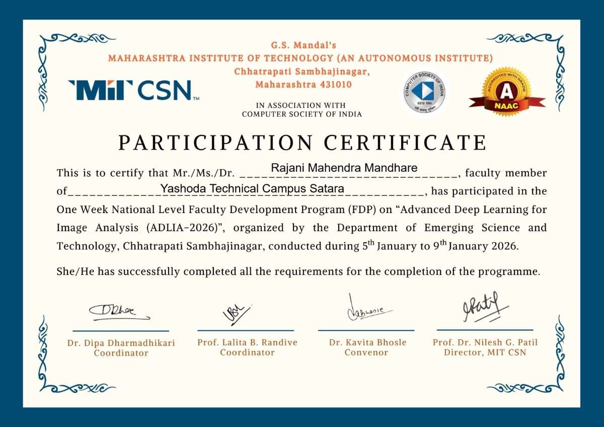 Mrs. Rajani Mandhare of Yashoda Technical Campus, Satara. has successfully completed one week National Level FDP on "Advance Deep Learning For Image Analysis ( ADLIA - 2026)" .