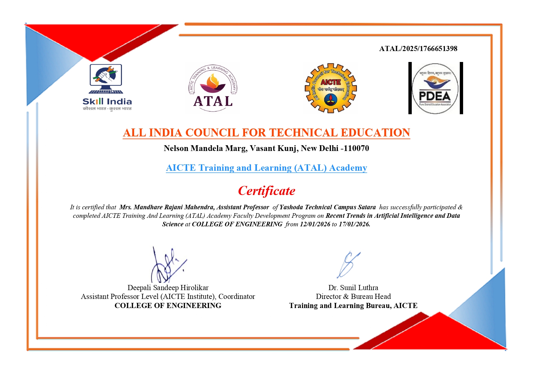 Mrs. Mandhare Rajani Mahendra, Assistant Professor of Yashoda Technical Campus Satara has successfully participated & completed AICTE Training And Learning (ATAL) Academy Faculty Development Program on "Recent Trends in Artificial Intelligence and Data Science".