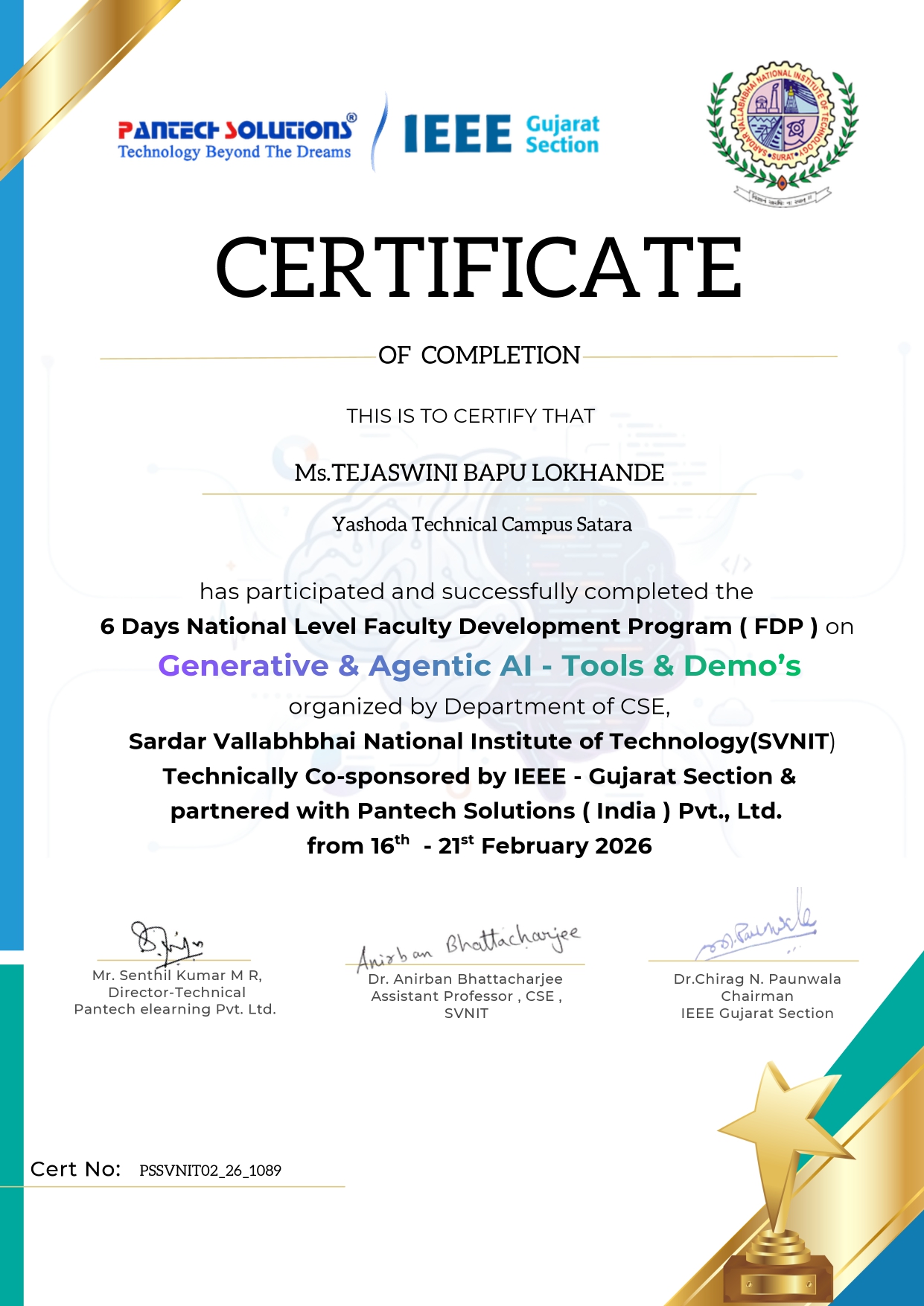 Ms. Tejaswini Lokhande of Yashoda Technical Campus, Satara. has successfully completed 6 days National Level FDP on "Generative & Agentic AI - Tools & Demo's".