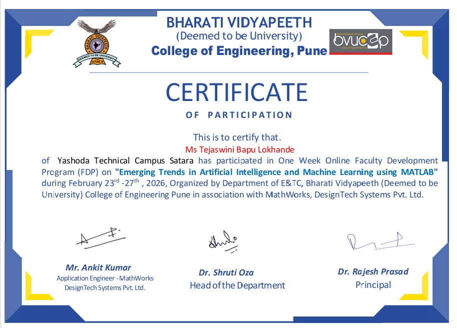 Ms. Tejaswini Lokhande of Yashoda Technical Campus, Satara. has successfully completed one week online FDP on "Emerging Trends in Artificial Intelligence And Machine Learning Using MATLAB".