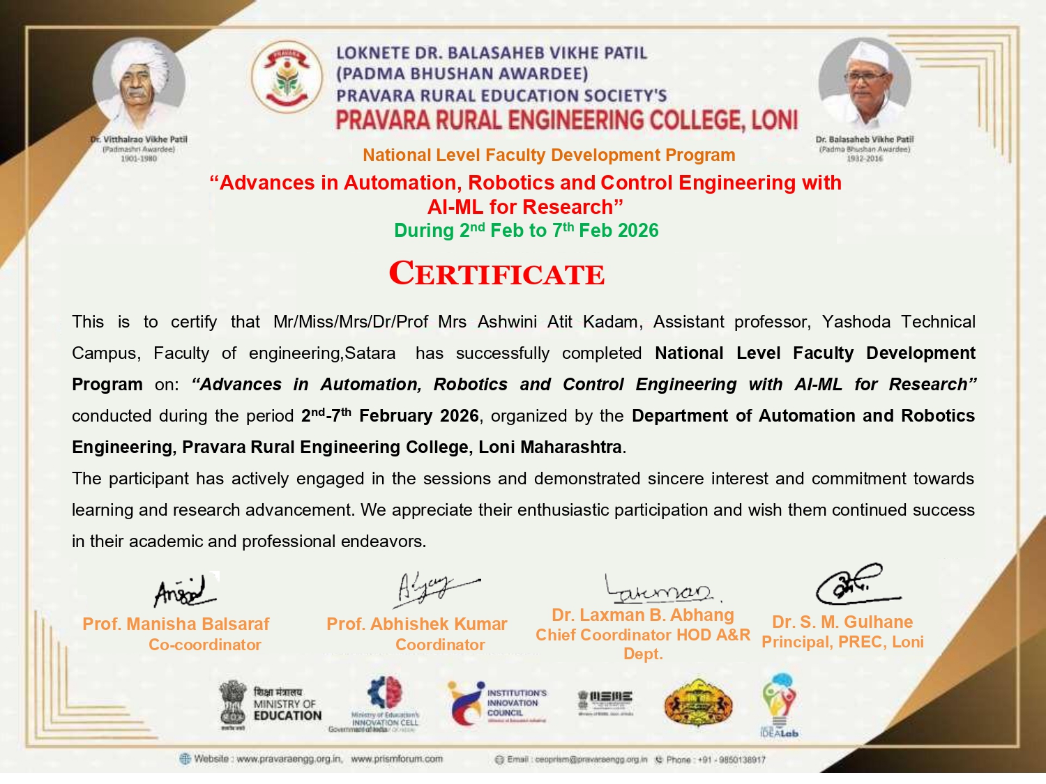 Mrs. Ashwini Atit Kadam has successfully completed National Level Faculty Development Program on: “Advances in Automation, Robotics and Control Engineering with AI-ML for Research” conducted during the period 2nd-7th February 2026,