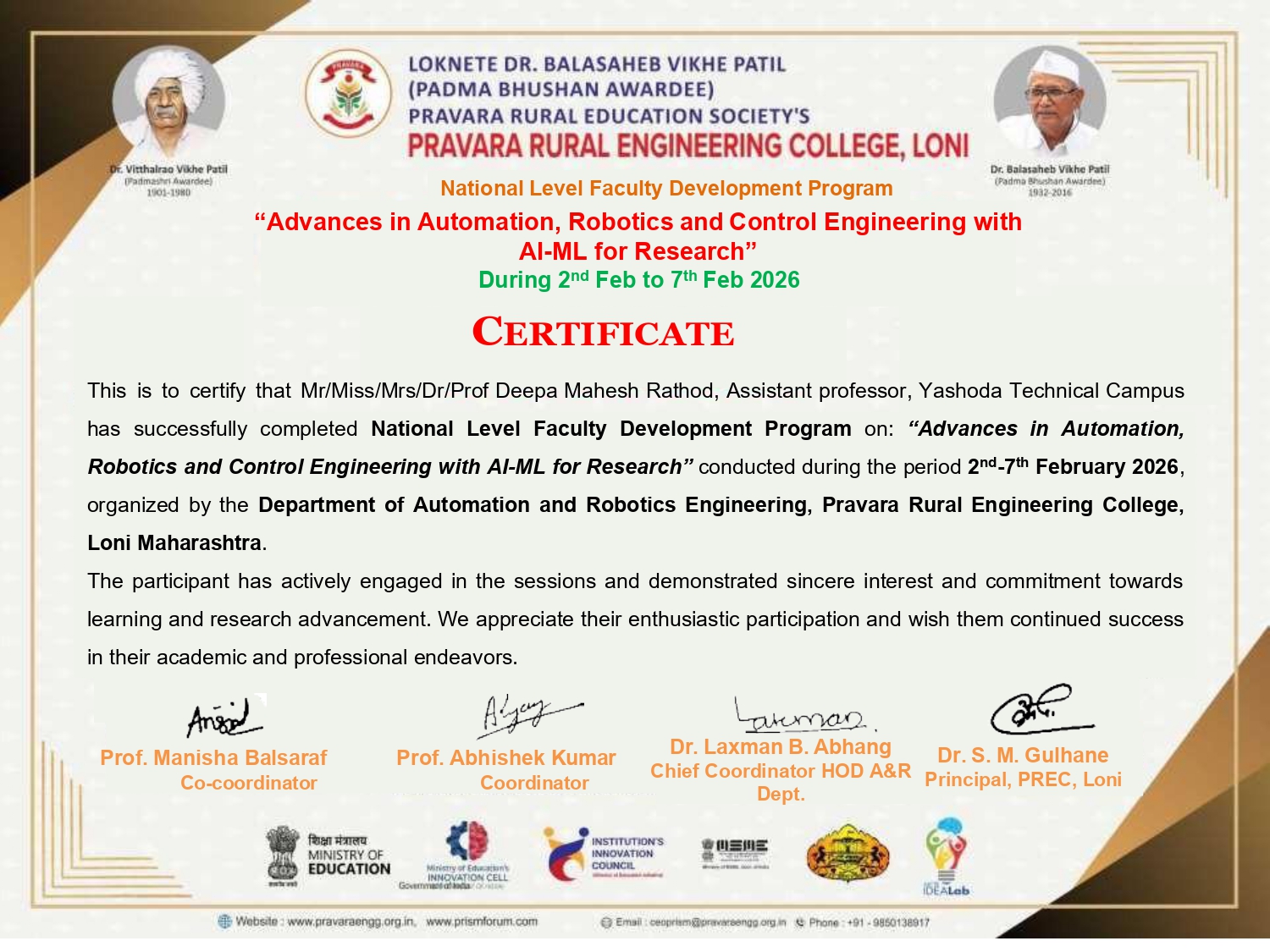 Mrs.Deepa Rathod has successfully completed National Level Faculty Development Program on: “Advances in Automation, Robotics and Control Engineering with AI-ML for Research” conducted during the period 2nd-7th February 2026.