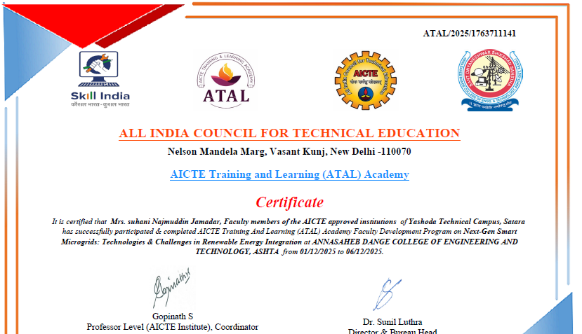 Prof. S. N. Jamadar successfully completed AICTE Training And Learning (ATAL) Academy Faculty Development Program on Next-Gen Smart Microgrids: Technologies & Challenges in Renewable Energy Integration at Annasaheb Dange College of Engineering and Technology, Ashta from 01/12/2025 to 06/12/2025.