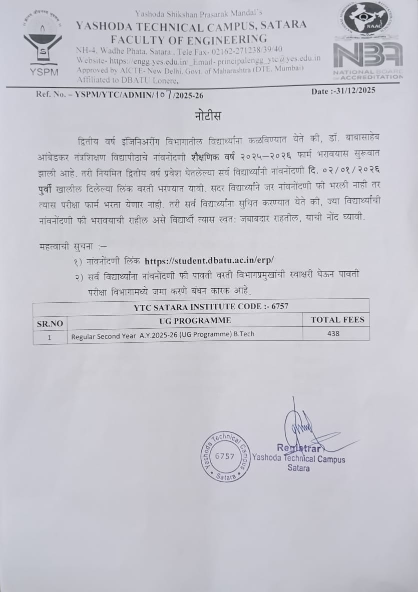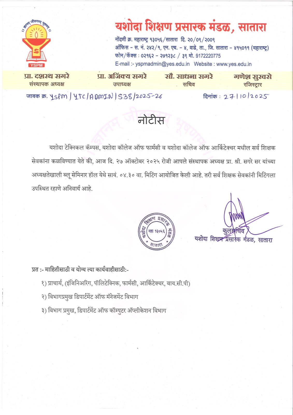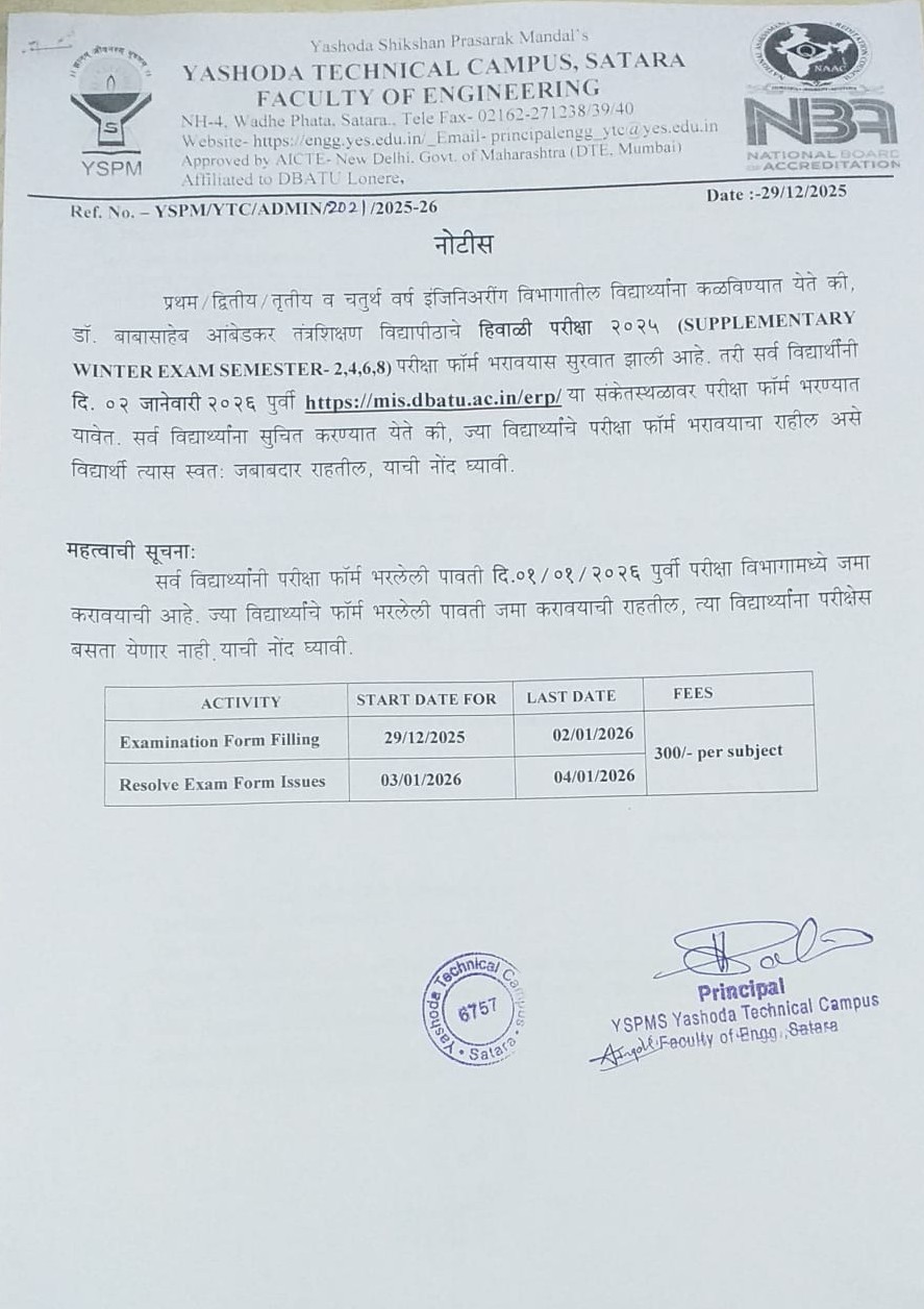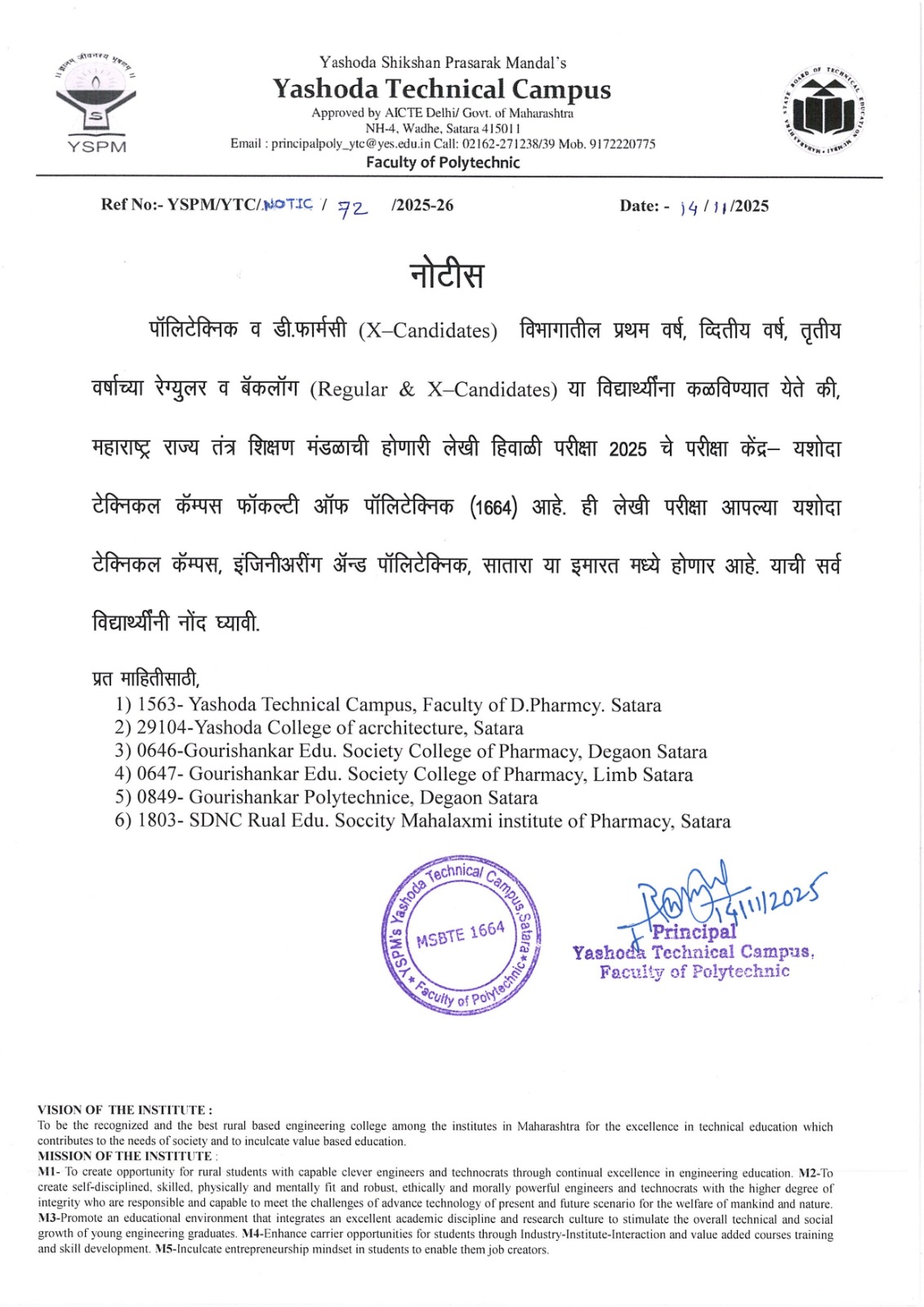 लेखी परीक्षा यशोदा टेक्निकल कॅम्पस इंजिनिअरींग अँड पॉलिटेक्निक, सातारा या विभागामध्ये होणार आहे त्याबाबत.. |