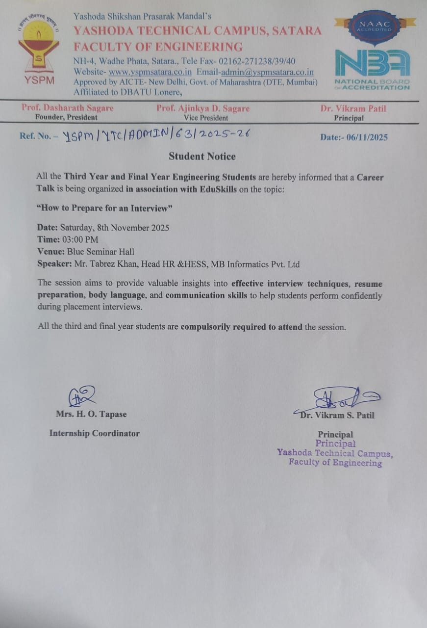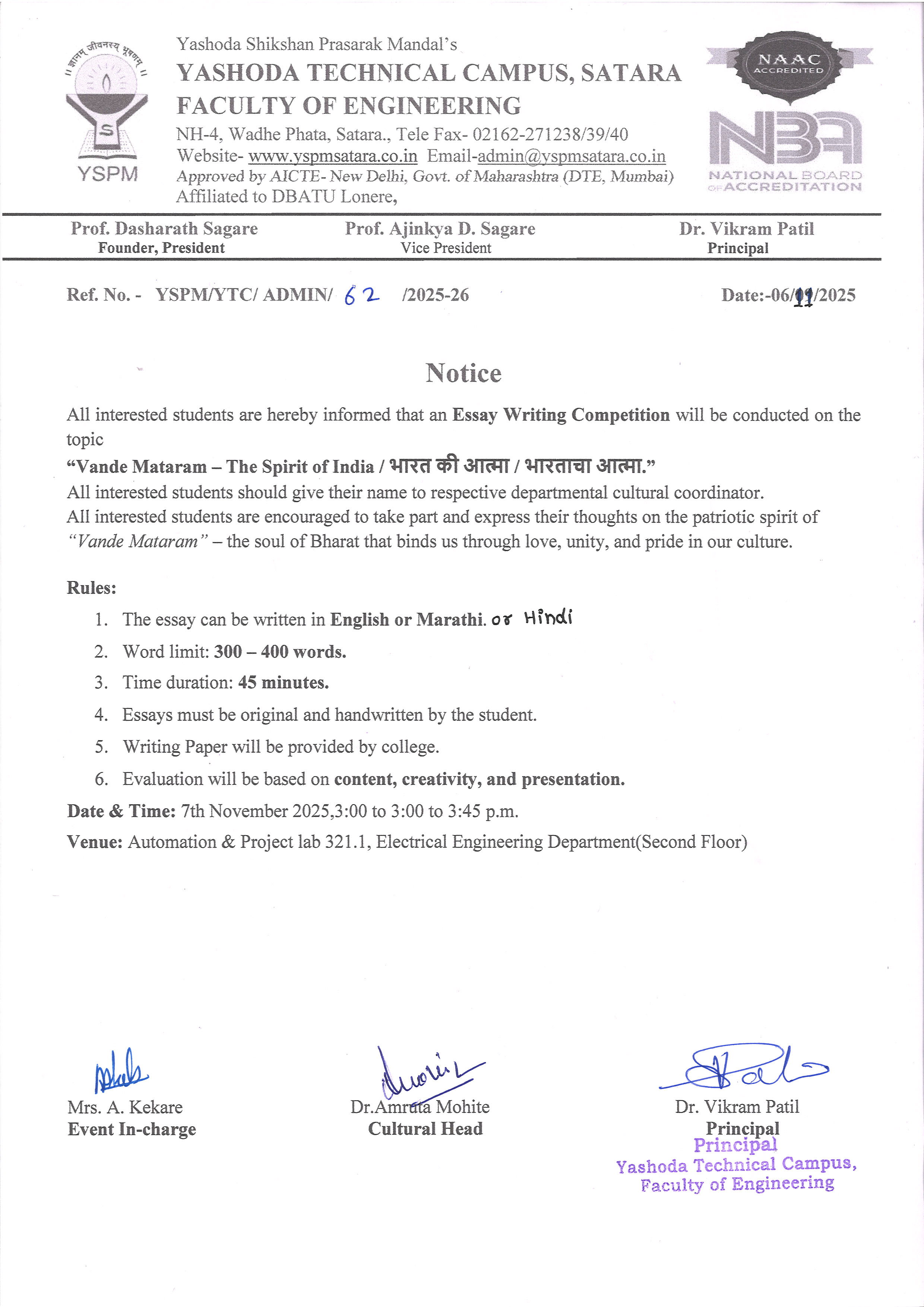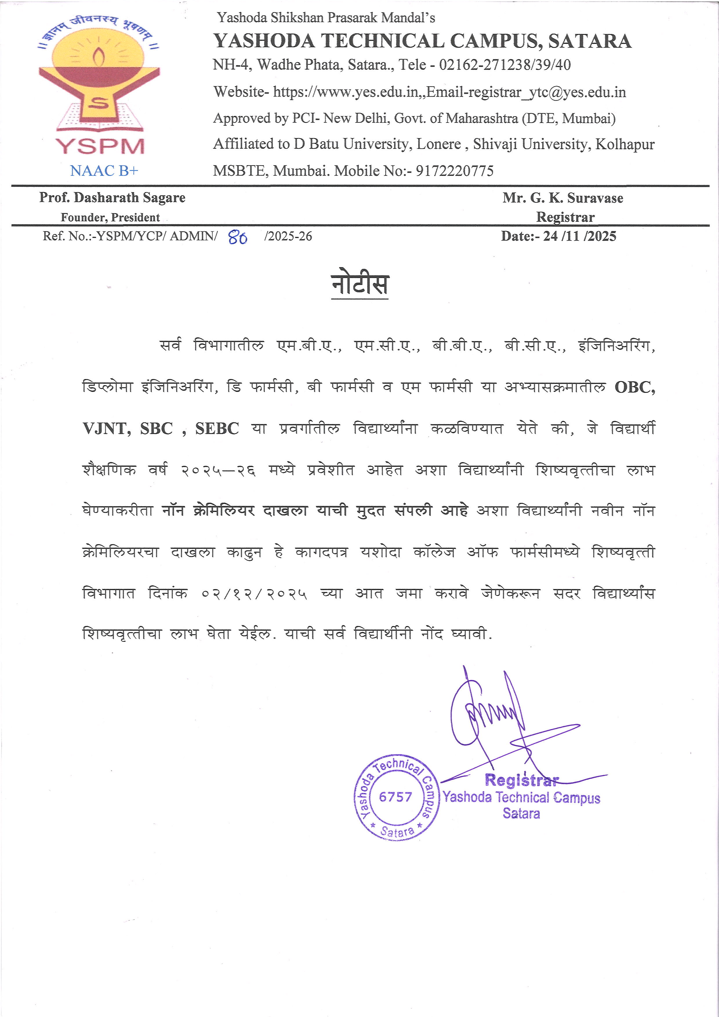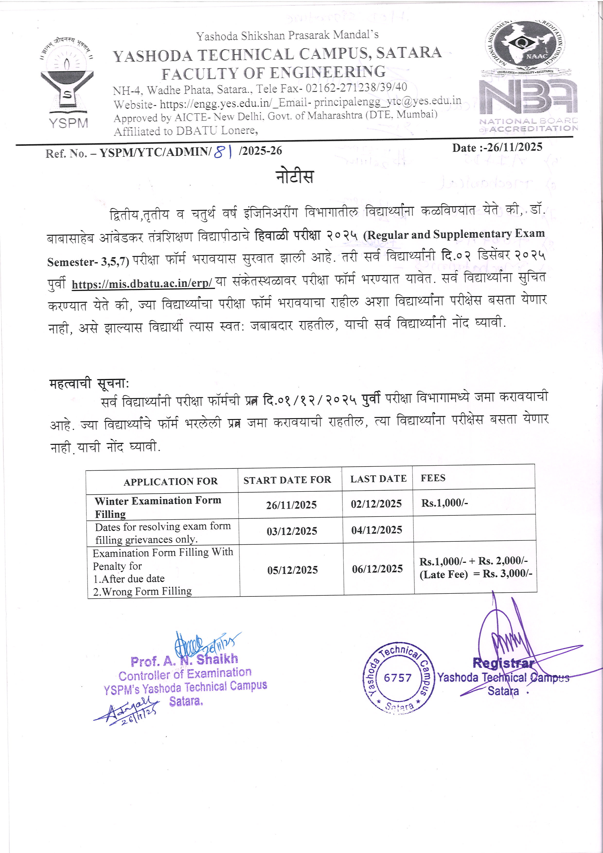 लेखी परीक्षा यशोदा टेक्निकल कॅम्पस इंजिनिअरींग अँड पॉलिटेक्निक, सातारा या विभागामध्ये होणार आहे त्याबाबत.. |