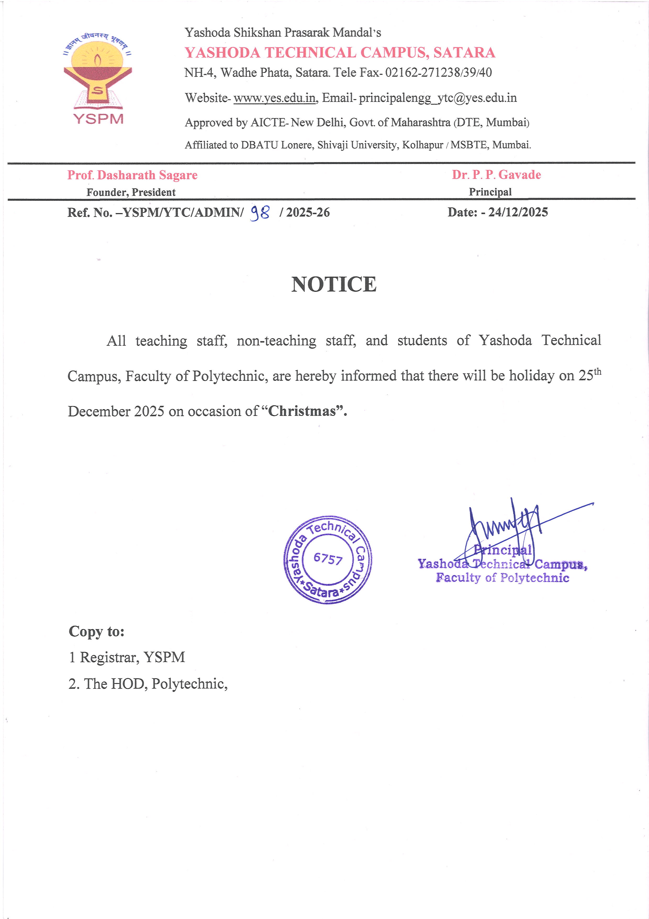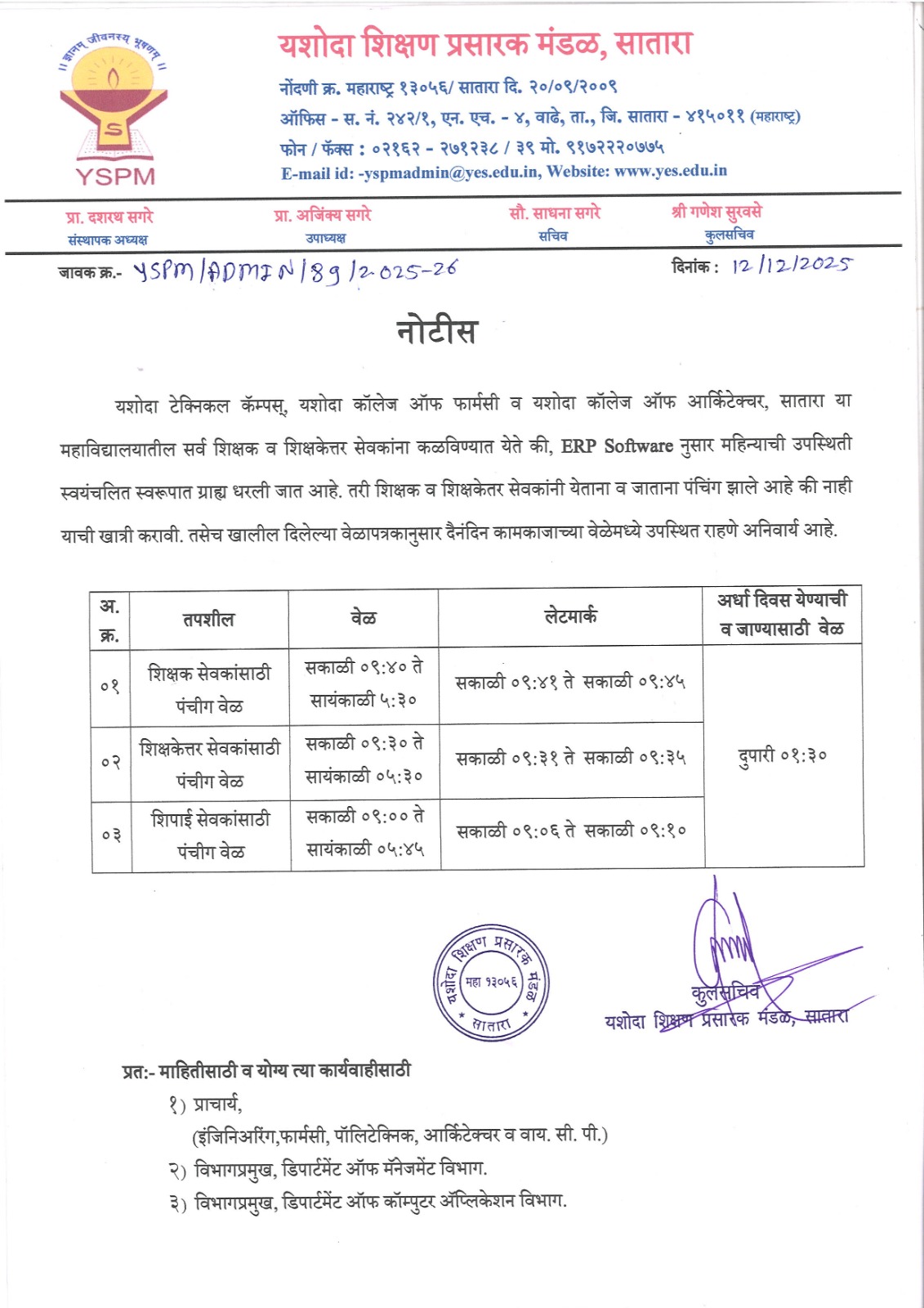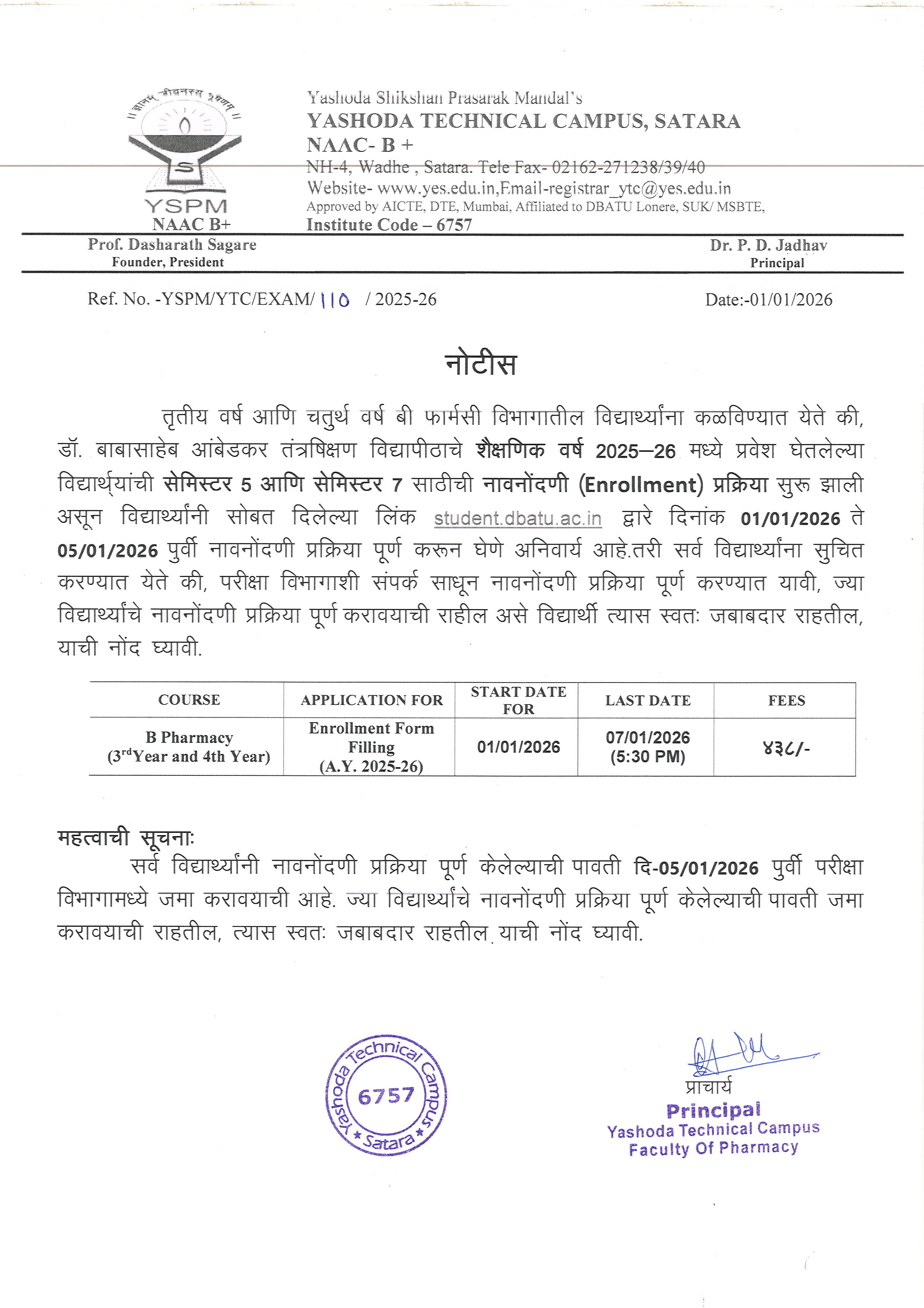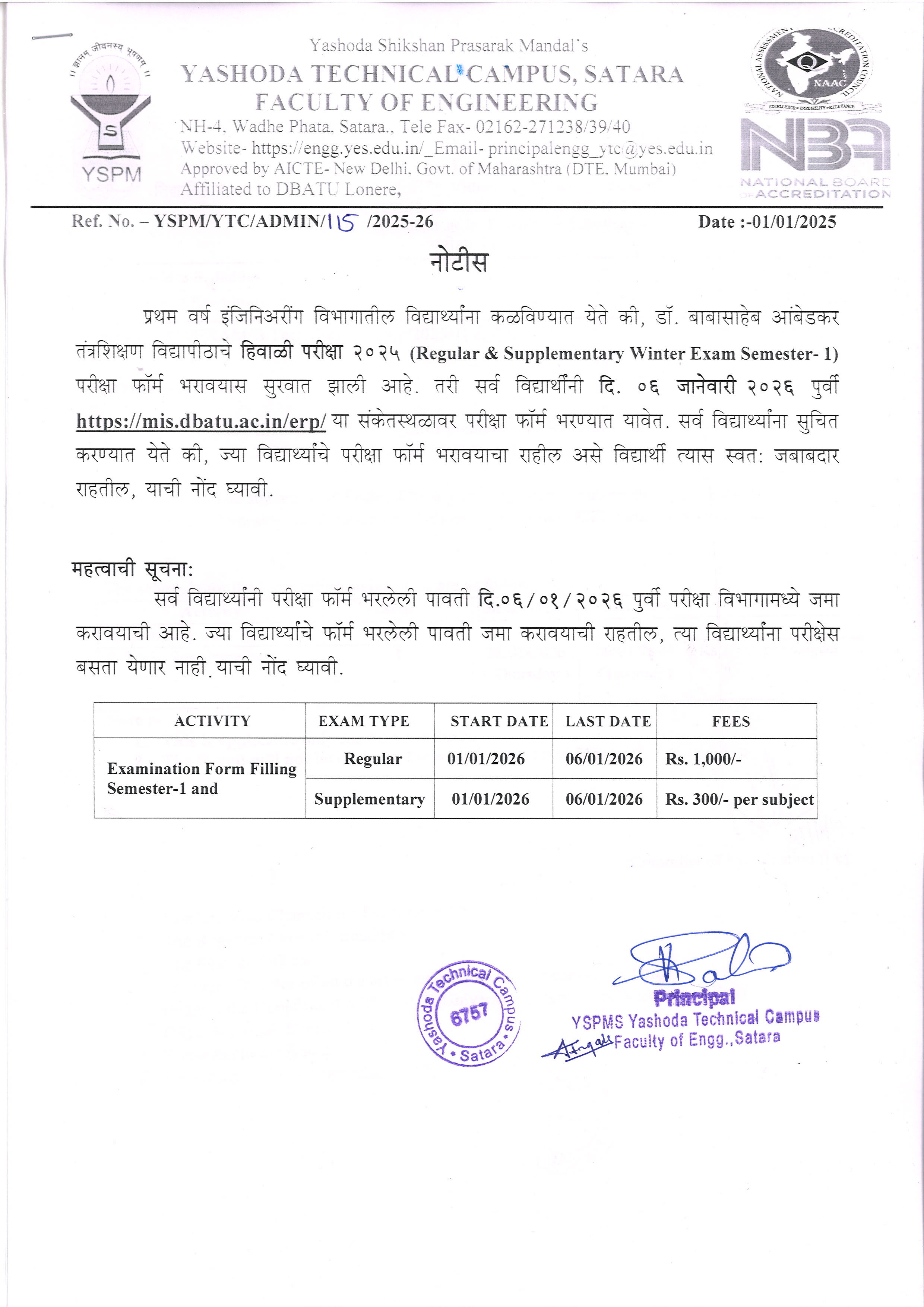 लेखी परीक्षा यशोदा टेक्निकल कॅम्पस इंजिनिअरींग अँड पॉलिटेक्निक, सातारा या विभागामध्ये होणार आहे त्याबाबत.. |