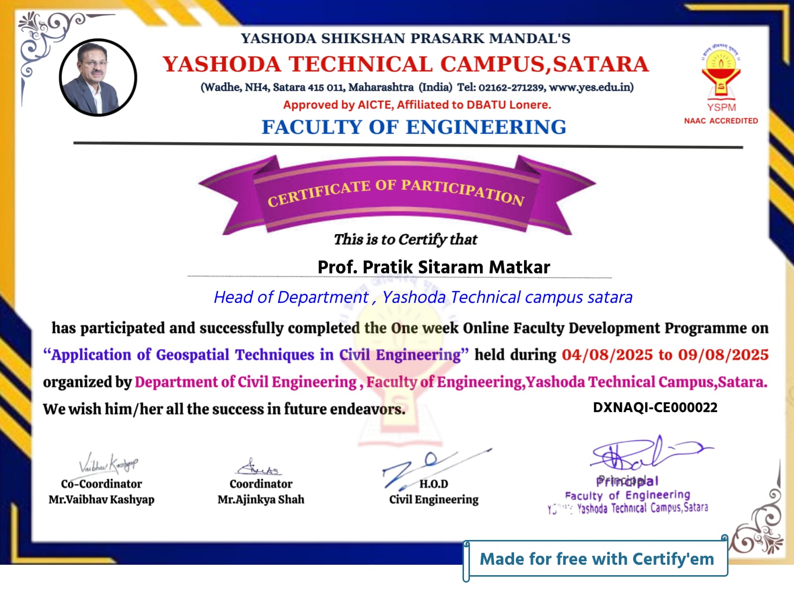 We are proud to announce that Prof. Pratik Sitaram Matkar, Head of the Civil Engineering Department, Yashoda Technical Campus, Satara, has successfully participated in and completed the Faculty Development Program (FDP) on "Application of Geospatial Techniques in Civil Engineering".