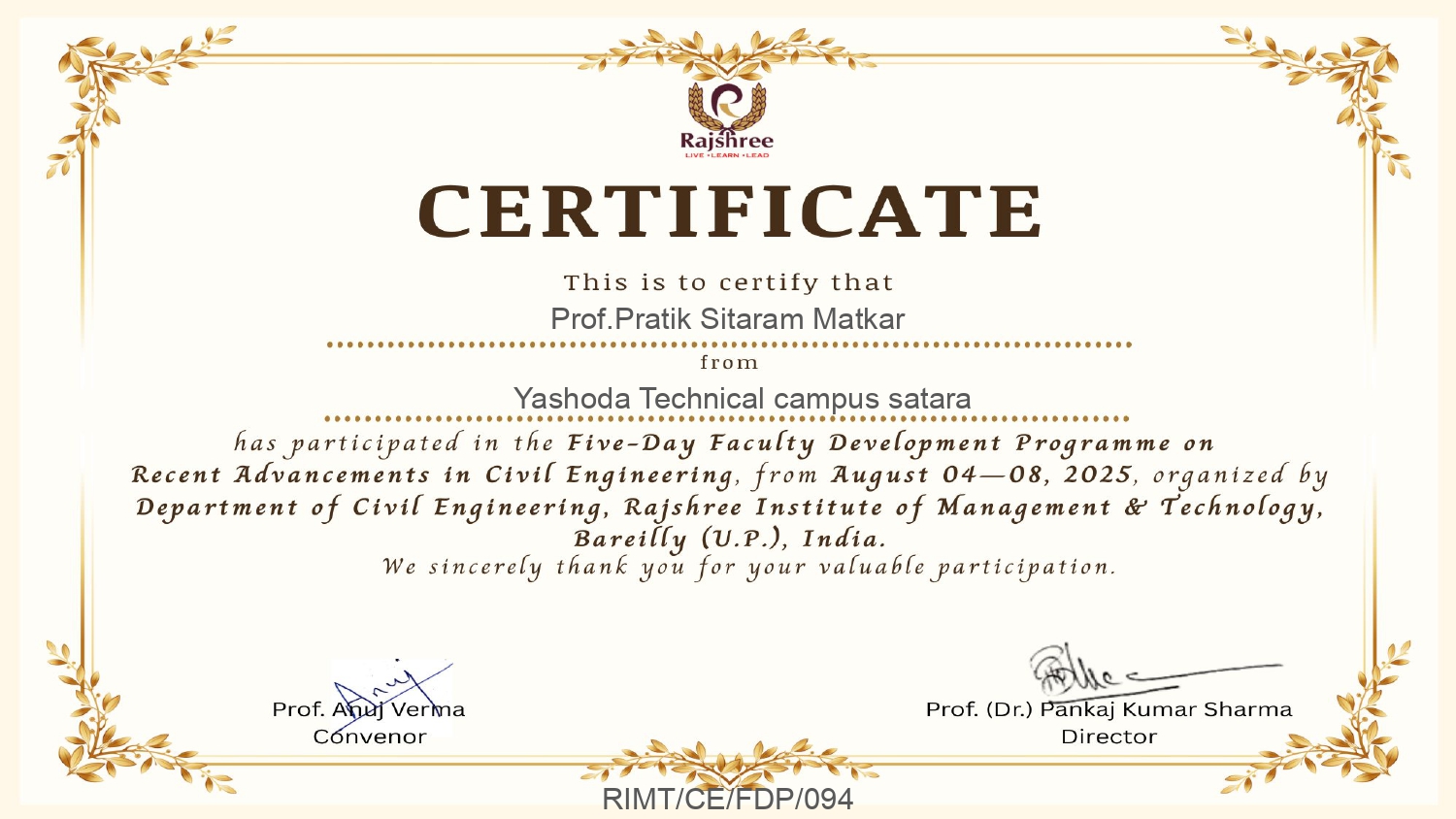 Prof. Pratik Sitaram Matkar, Head of the Civil Engineering Department, Yashoda Technical Campus, Satara, actively participated in a Faculty Development Program (FDP) on “Recent Advancements in Civil Engineering”. The program was organized by the Department of Civil Engineering, Rajshree Institute of Management and Technology, Bareilly (U.P.), from 4th to 8th August 2025.