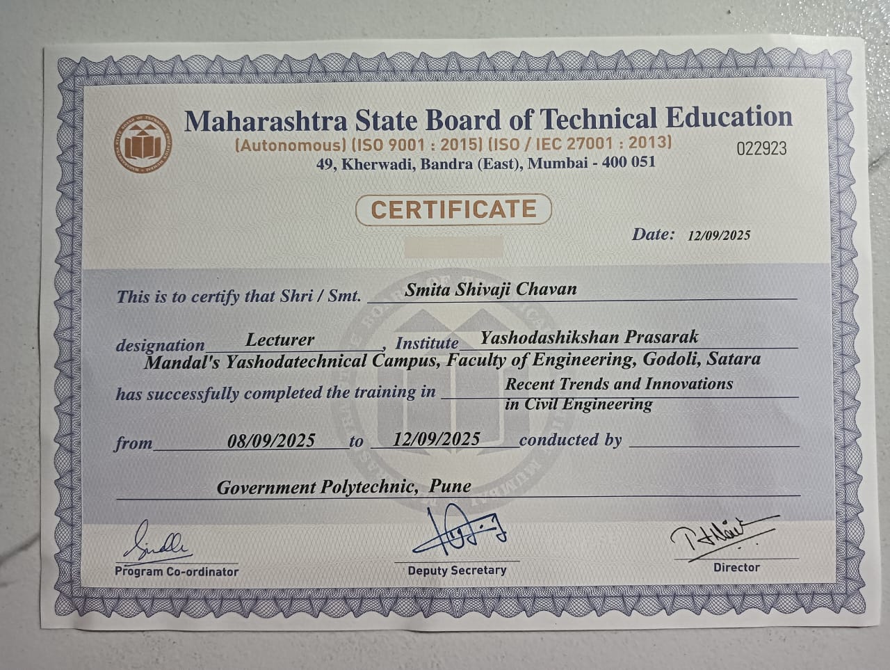 Ms. Smita Shivaji Chavan has successfully completed a one-week Faculty Development Training Program on Recent Trends & Innovations in Civil Engineering. The program was held from 8th September to 12th September 2025 and was organized by the Department of Civil Engineering, Government Polytechnic Pune.
