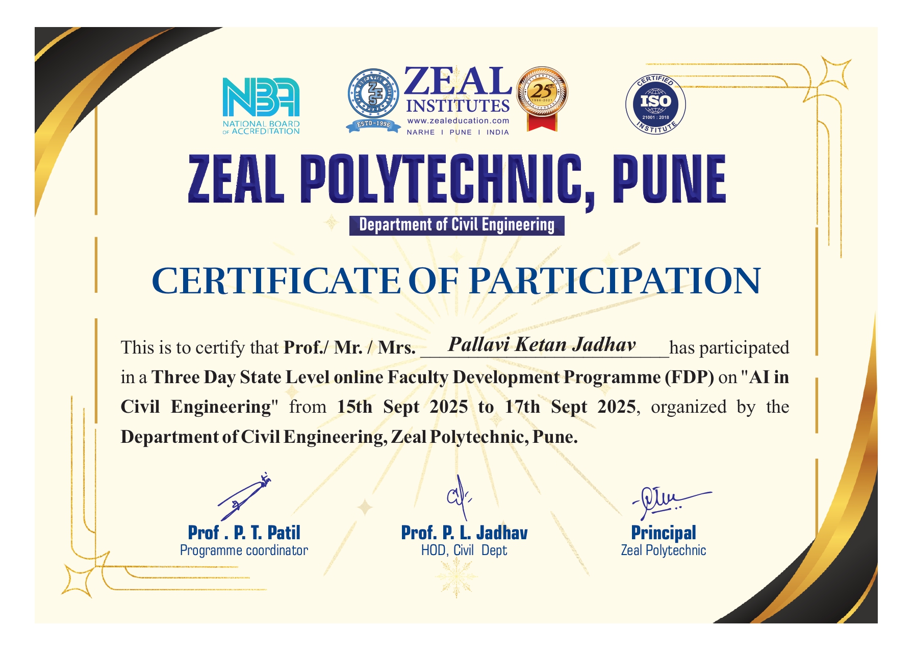 Mrs. Pallavi Ketan Jadhav has successfully completed a three-day Online Faculty Development Programme (FDP) on the topic “AI in Civil Engineering”, organized from 15th September 2025 to 17th September 2025.The FDP aimed to enhance the knowledge of participants in the rapidly emerging field of Artificial Intelligence (AI) and its applications in Civil Engineering. During the programme, participants explored the integration of AI with civil engineering practices such as structural health monitoring, predictive analysis, design optimization, and image-based infrastructure inspection.
