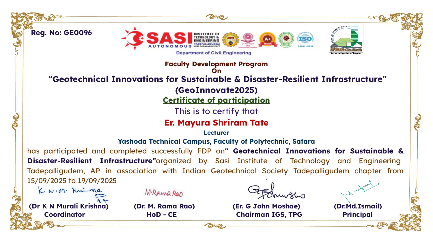 Mrs. Mayura Shriram Tate has successfully completed a five-day Online Faculty Development Programme (FDP) on the theme “Geotechnical Innovations for Sustainable & Disaster-Resilient Infrastructure”, organized by Sasi Institute of Technology and Engineering (SITE), Tadepalligudem, Andhra Pradesh, in association with the Indian Geotechnical Society (IGS), Tadepalligudem Chapter, from 15th to 19th September 2025.