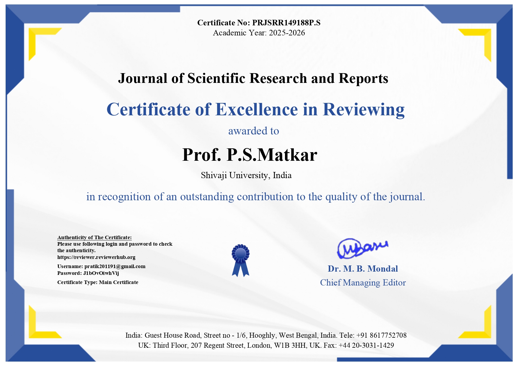 This recognition has been conferred in appreciation of his outstanding contribution to the quality of the journal through dedicated and insightful peer-review work. The certificate was issued under the signature of Dr. M. B. Mondal, Chief Managing Editor, acknowledging Prof. Matkar’s commitment to maintaining high academic and research standards.