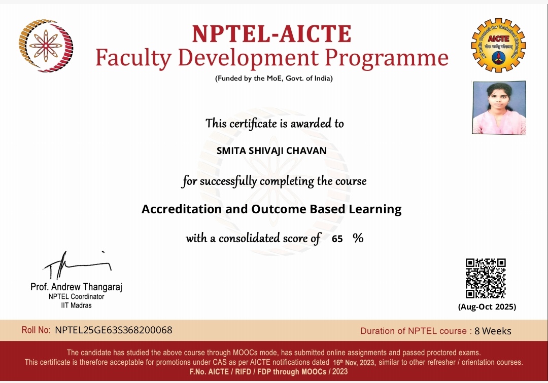 Ms. Smita Shivaji Chavan, Lecturer in the Civil Engineering Department, has successfully completed the NPTEL–AICTE Faculty Development Programme on Accreditation and Outcome Based Learning with a consolidated score of 65% (Aug–Oct 2025).